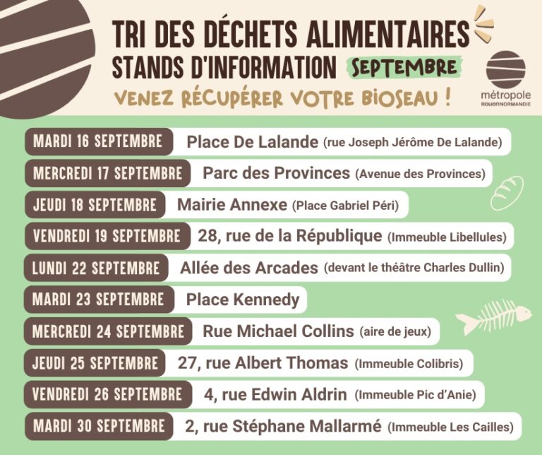 Dès mi-septembre, dans chaque quartier, la Métropole vous accueillera de 15h à 18h sur ses stands de sensibilisation pour vous remettre gratuitement votre bioseau et un livret explicatif. Les dates seront également communiquées via affichage dans les halls d’immeubles et sur les réseaux sociaux de la Ville.