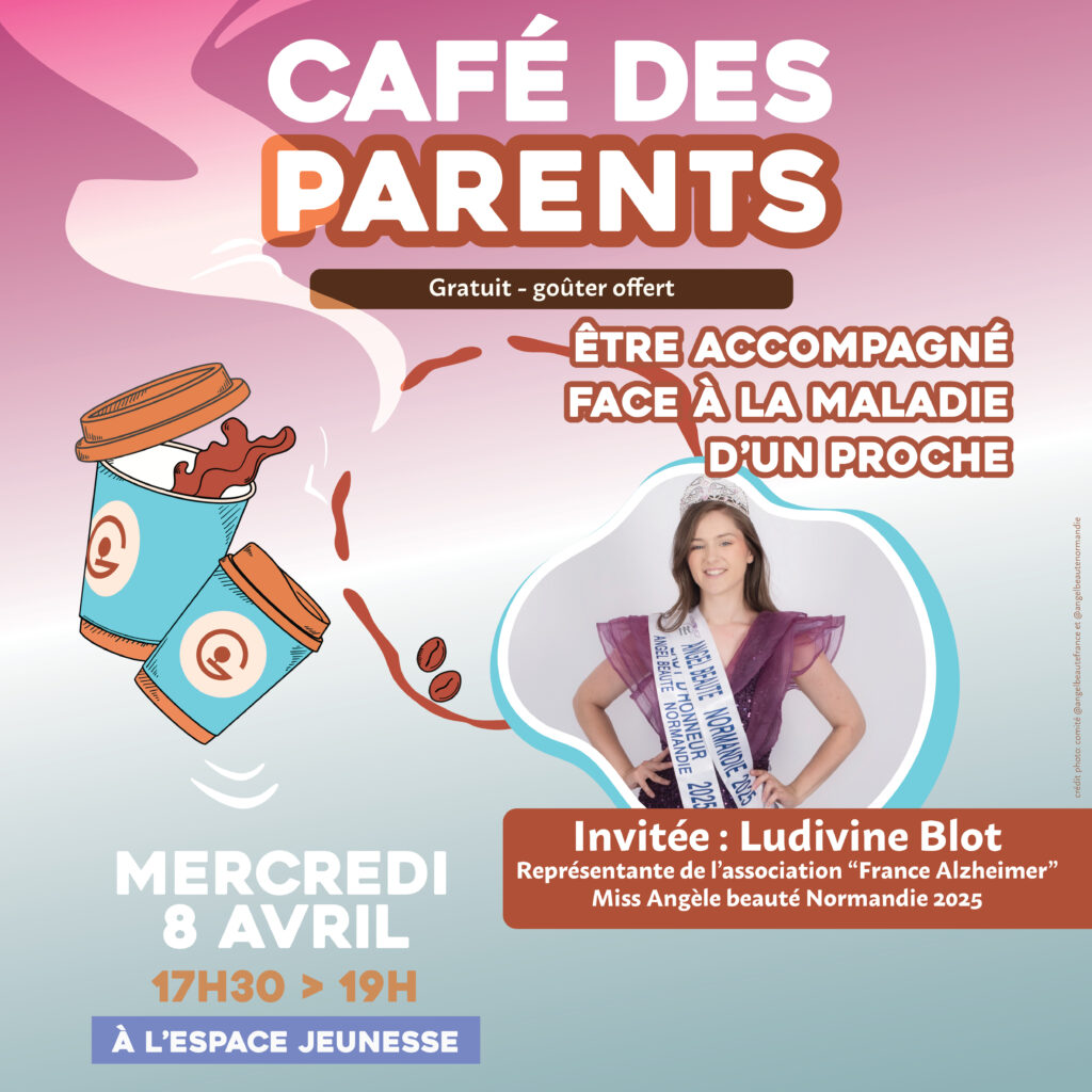 Le prochain café se tiendra le mercredi 8 avril de 17h30 à 19h à l’Espace jeunesse et abordera l’aide à l’accompagnement face à la maladie d’un proche. Ludivine Blot, représentante de l’association France Alzheimer, sera invitée pour l’occasion. Ce temps d’interview et d’échange sera l’occasion pour vous de découvrir son parcours, sa mère ayant été touchée par la maladie d’Alzheimer à l’âge de 47 ans.