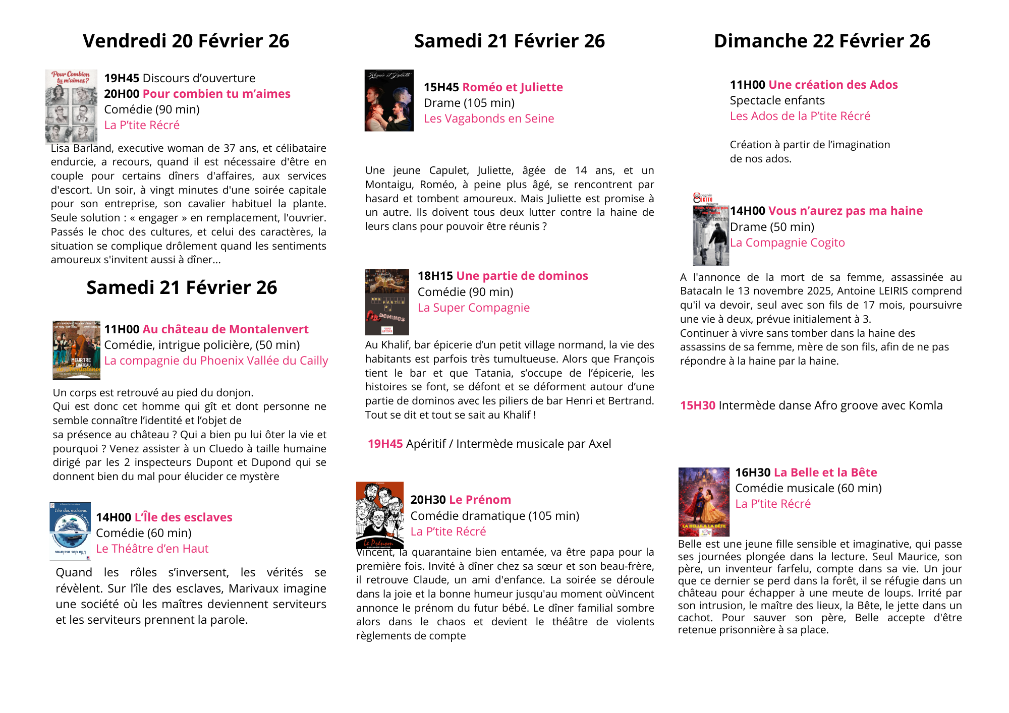 Nous vous attendons nombreux dès vendredi 20 février, première pièce jouée par LA P’TITE RECRE – Pour combien tu m’aimes
