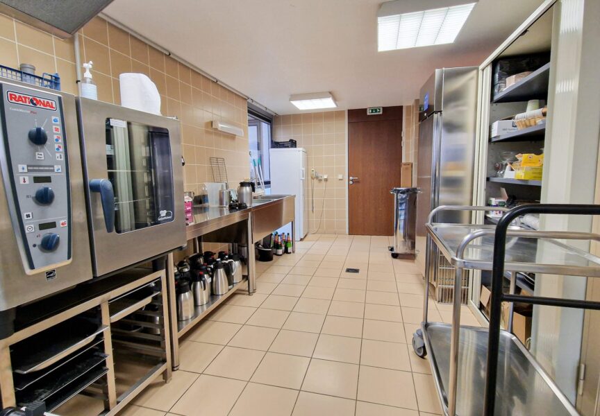 Arrière cuisine : frigo standard 3 étages, grand frigo 5 étages, 1 point d’eau (évier), des verres softs et flutes pour 100 personnes, lieu de stockage des 16 tables (à monter) à disposition.